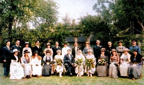 Wedding of Dorothy Frances Scammell to Thomas Taylor in a colourised photograph of 1919. Taken at “Elmleigh”, Stapleton, Martock. Ella and Netta are seated to the right of the bride and bridesmaid and are enlarged in the photo below.