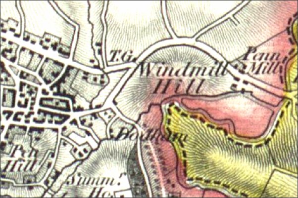 An extract of Edward Mogg’s map of 1817 (north is roughly to the right). Towards the bottom and above the text “Windmill Hill” is the Goar Knap Turnpike Gate - shown as an "X" actually across Sherborne Road. The road seen running off to the right between "Turnpike" and "Windmill Hill" is Brickyard Lane (today's St Michael's Avenue).