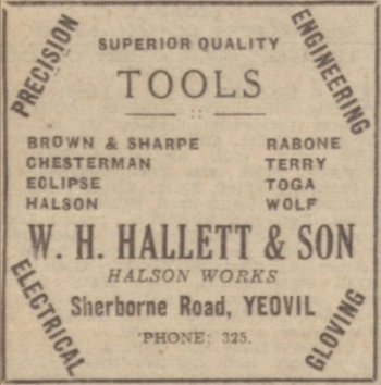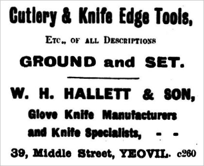 In this advertisement from the 11 November 1921 edition of the Western Chronicle, repeated weekly for many weeks, Hallett & Son remained as glove knife manufacturers and knife specialists. Indeed, in the 1939 England and Wales Register (essentially a pre-war census), William Jnr still gave his occupation as a "Glove Knife and Edge Tool Manufacturer".