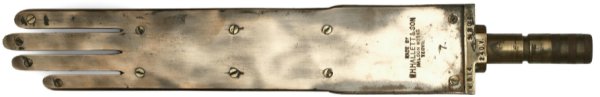 Above, is a brass heated glove hand, dating to around 1950, manufactured by WH Hallett & Son of the Halson Works, Sherborne Road, and a similar glove hand seen below attached to the heating element. |