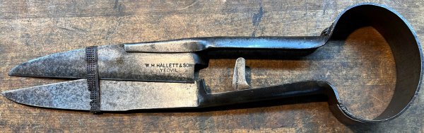WH Hallett & Son started in 1911 and these shears were the traditional method used to cut leather for gloves. Within a very short time however, most gloves were cut by metal dies that mechanically stamped out glove blanks - the advantage being uniformity of the blanks and the speed with which they could be produced. Although it is difficult to put an end date on their use (Hallett was still producing them into the 1920s), I would think that the period of highest use would be between 1911 and the start of the war in 1914.