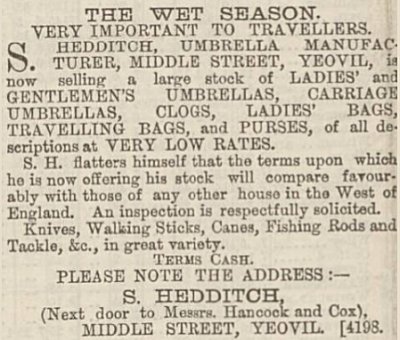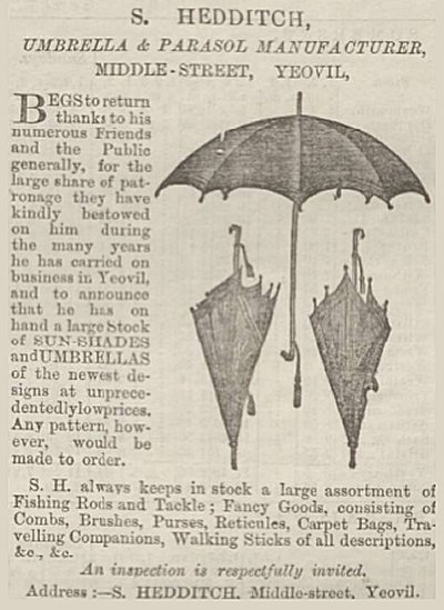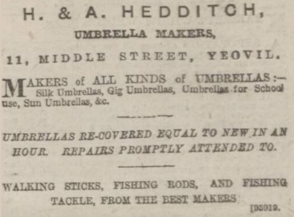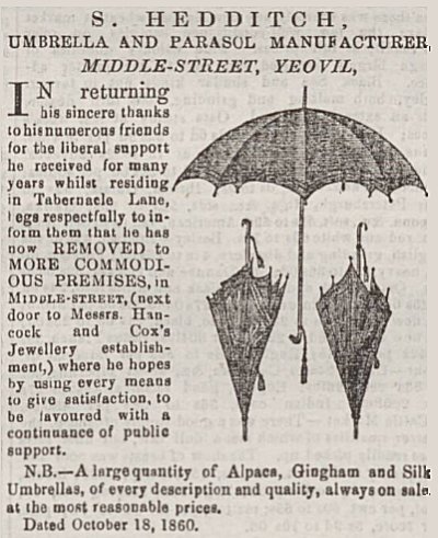 It is not known when Silas moved his family to Yeovil but Hunt & Co's Directory of 1850 listed him as an 'Umbrella Maker of Hannam's Lane' (today's Tabernacle Lane). In the 1851 census Silas, Jane and their four children were listed living in Hannam's Lane. Silas gave his occupation as an umbrella maker, Henry was a journeyman painter while all three daughters were glove sewers. Slater's Directory of 1852 listed him as 'Silas Hedditch, Umbrella Manufacturer of South Street' (Tabernacle Lane dwellings were often referred to as being in South Street).