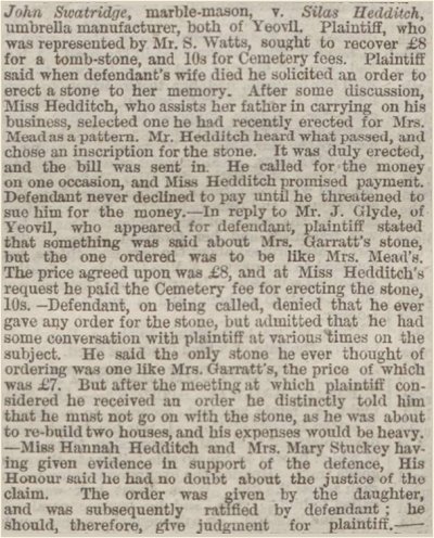 In August 1873 Silas was taken to court by John Swatridge, marble mason and photographer, for non-payment of his bill for his wife's headstone. This report is from the 8 August 1873 edition of the Western Gazette.
