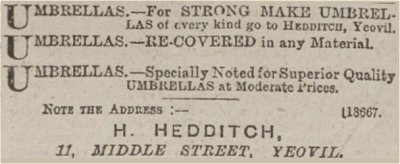 In the 1881 census 37-year old Hannah, who remained unmarried, was still at 11 Middle Street and gave her occupation as an umbrella repairer. Living with her was her 18-year old nephew Arthur Hedditch, who worked as her assistant. Hannah was listed in Whitby's Yeovil Almanack Advertiser of 1882 as 'Miss H Hedditch, Umbrella Maker of 11 Middle Street'. From the advertisement of 1883 placed by 'H&A Hedditch, Umbrella Makers', shown below, it appears that Hannah and Arthur entered a partnership. However, by the following year Hannah was placing her advertisements under just her own name of H Hedditch.