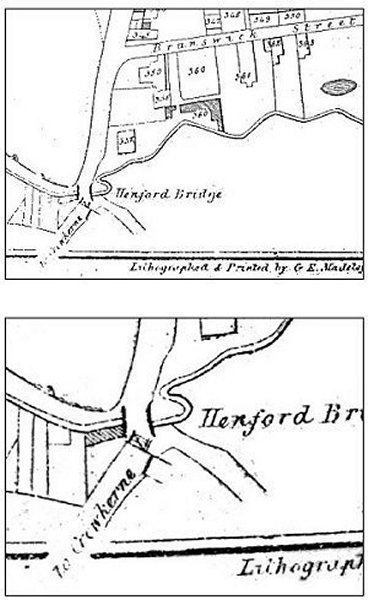 An extract of George Edward Madeley's (1798-1858) map of Yeovil of 1831, enlarged below, showing the Hendford Bridge Gate.