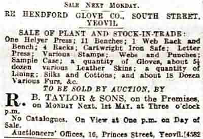 The notice of sale of plant and stock-in-trade of the Hendford Glove Co from the 28 April 1933 edition of the Western Gazette.