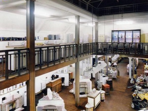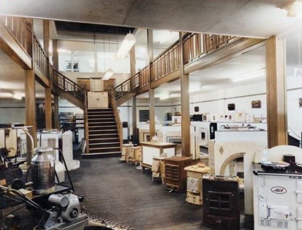 This is a general view of the shop's ground floor with a display of fireplaces and free-standing fires at left and a small selection of agricultural machinery at right.