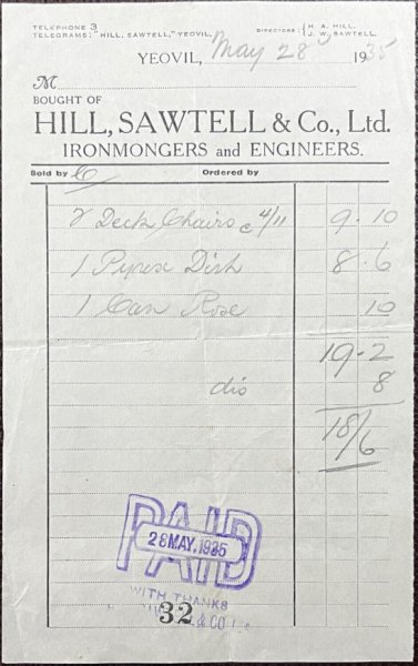 A Hill Sawtell receipt dated 238 May 1935. 9/10d for two deckchairs - bargain.