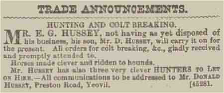 By 1871 Edward had moved his family to Yeovil and the census listed them at Townsend. Of the children, only John, Donald and Grace were listed, together with Mary's sister Camilla Peacock. Edward, by now aged 45, gave his occupation as a dealer in horses. In the 3 January 1879 edition of the Western Gazette, Edward announced that his son, Donald, would be taking over the business, although this arrangement clearly didn't last long.
