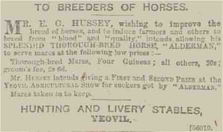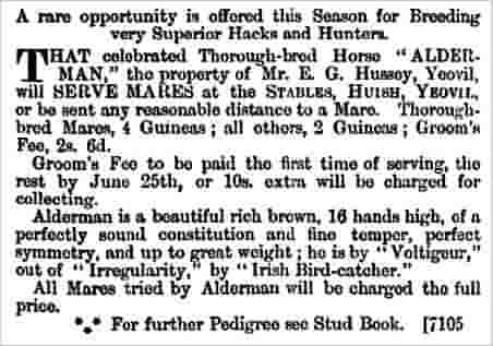 An advertisement placed by Edward in the 24 April 1879 edition of the Dorset County Chronicle outlining the form and prices of his stud 'Alderman'.