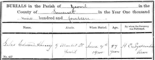 Edward Hussey died on 5 June 1914, aged 87. He was buried in Yeovil cemetery and his burial was recorded in St John's parish register. His will was proved at Taunton in June and his effects were valued at £74 0s 2d (about £7,000 at today's value).