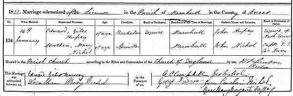On 14 January 1851 at Marnhull parish church, Edward married Dorothea Mary Nichol (1826-1900), known as Mary. Edward and Mary were to have five children; John Giles (b1853), Edward Giles (b1855), Donald (b1856), Grace Mary (1858-1935) and Margaret Ann (1861-1862). In the 1851 census, the newlywed Edward and Mary were listed living with Edward's family at Nash Court. Edward gave his occupation as a farmer of 100 acres, employing 11 labourers.