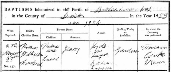 The record of Thomas' baptism from the parish register of Holy Trinity church, Bothenhampton.