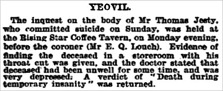 The report of the inquest held to investigate Thomas Jesty's suicide from the 17 February 1904 edition of the Western Daily Press.
