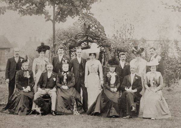 The wedding group pose for a photograph after the marriage of Walter Stanley Johnson and Annie Barrett on 5 June 1900 (they are standing under the archway). His father, and founder of Ewens, Johnson & Co., William Walter Johnson, is sitting with a dog at his feet.