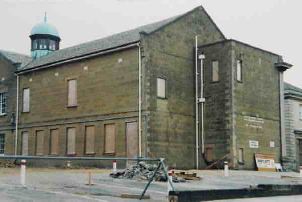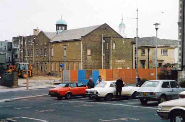 Photographed in 1985, the site at the rear of the boarded-up municipal offices is cleared ready for construction of the new library. Note that the wooden 'shed', South Street end of which held the children's library, had been removed by this time.