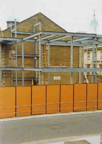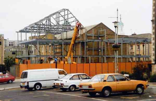 The former council staff car park is screened off, while a digger starts ground works at left. Photographed in 1985.