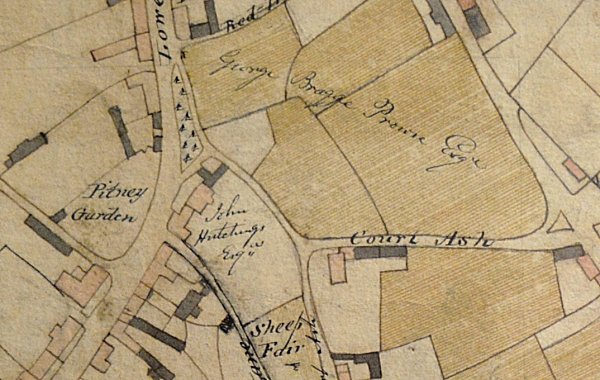 Edward Bullock Watts' 1806 map of Yeovil showing, just left of centre Mansion House and (today's) Magnolia House alongside - the whole parcel being annotated "John Hutchings Esq".