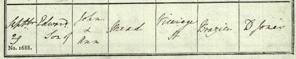 The record of the 29 September 1825 baptism of John and Ann's son, Edward, from the registers of St John's church. Note that John is described as a brazier of Vicarage Street.
