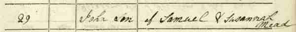 John Mead was born in Crewkerne in 1797 and baptised on 29 January 1797 at St Bartholomew's church, Crewkerne. He was the son of Samuel and Susannah Mead and had at least two younger siblings; Samuel (b1798) and Ratchel (b1802).