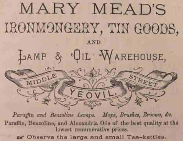 John Mead died in Yeovil during the autumn of 1870. Following his death, and for most of the following decade, Mary continued to run the ironmongery business under her own name (see Gallery). In the 1871 census she was listed living above the shop premises with a boarder, photographer William Sugg, and two domestic servants. Mary gave her occupation as an ironmonger.