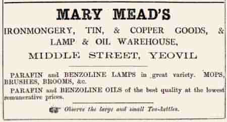 By the time of the 1861 census 64-year old John had remarried and was living with his new wife Mary (b1815, Yeovil), eighteen years his junior, above his new hardware shop in Middle Street. John gave his occupation as 'Copper Smith, Tinman etc Employing 2 men and 2 boys'. In the Post Office Directory of 1866, John Mead was listed as an ironmonger of Middle Street.