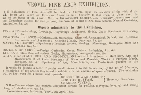 From this advertisement placed in the 8 April 1856 edition of the Western Flying Press, it is seen that Robert Shout was one of three honorary secretaries (the other two being Timothy Huffam and Charles Vining) of the Yeovil Mutual Improvement Society and Literary Institution.