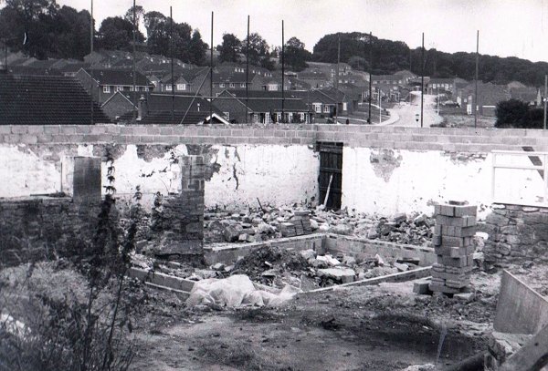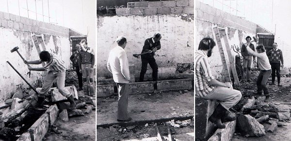 Committee members take turns to demolish the old cattle stalls. Photographed in 1977.