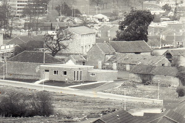 The old farm cottages at the rear of the Yew Tree Inn, seen at top right. Photographed around 1977. The Yew Tree Inn had been the original farmhouse of Yew Tree Farm.