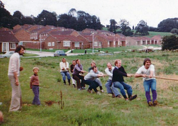 The tug-of-war took place on the waste ground that is now Holy Trinity School and Plantagenet Park. Photographed in 1977.