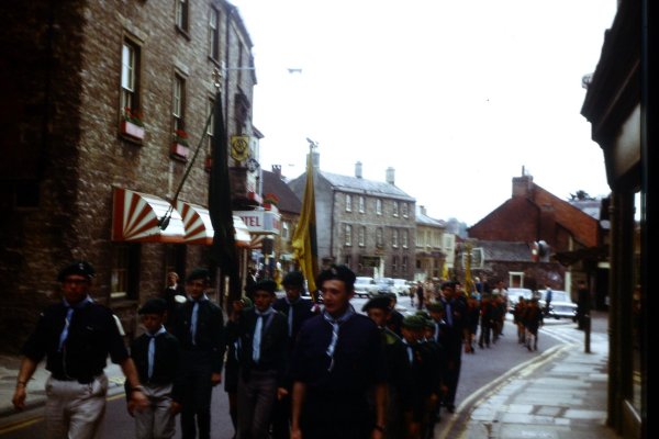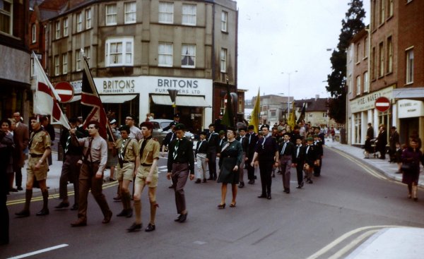 The parade had traditionally ended at St John's church but by the time of this series of photographs of 1968 the church had become too small to hold all those attending the service. In 1968 the service was held in what was then the Gaumont cinema, simply because it could accommodate the large numbers of people involved in the parade. Andy recalls that a couple of years later the service was held at the football ground in Huish "on a bitterly cold day". I recall standing in the Borough to watch the parade many times in the late 1980s as my sons took part as Cubs.