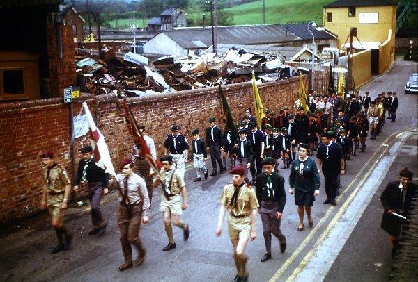 A detachment of Boy's Brigade, Scouts and Cubs assembles at the bottom of Stars Lane. Many people will remember the scrapyard of Johnny Farr at left. In the background are the lower slopes of Summerhouse Hill with the footbridge over the railway at top right. At extreme right is the end of the first house in Summerhouse Terrace.