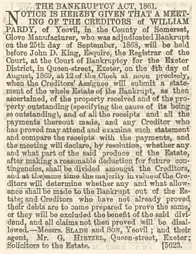 The notice of William's bankruptcy from the 2 July 1869 edition of the Western Gazette.