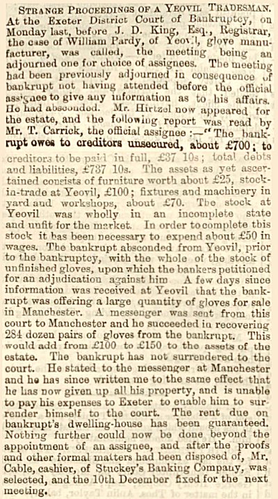 The "Strange Proceedings of a Yeovil Tradesman" - the story of William's bankruptcy and his absconding to Manchester to sell his stock as reported in the 23 October 1868 edition of the Western Gazette.