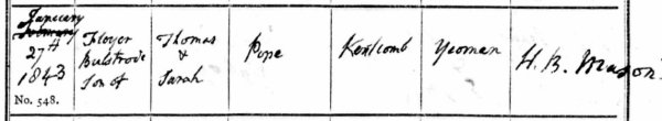 Floyer Bulstrode Pope's 27 January 1843 baptism record from the Toller Porcorum parish register.
