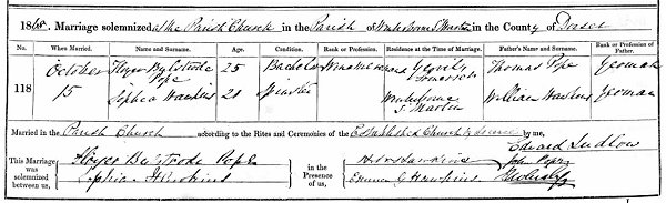 The record of Floyer and Sophia's 15 October 1868 marriage from the parish register of St Martin's church, Martinstown, Dorset.