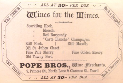An advertisement from the 1883 edition of Whitby's Yeovil Almanack Advertiser. Although Floyer is known to have been the senior partner of Pope Brothers, I have been unable to identify the other Pope brothers. Note that Floyer's business had expanded with premises in North Lane and Clarence Street as well as the original Princes Street premises.