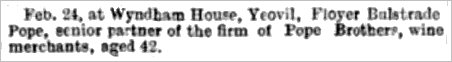 Floyer Pope died at his home, Wyndham House, on 24 February 1885. He was 42 years old. He was buried in Yeovil on 26 February 1885.