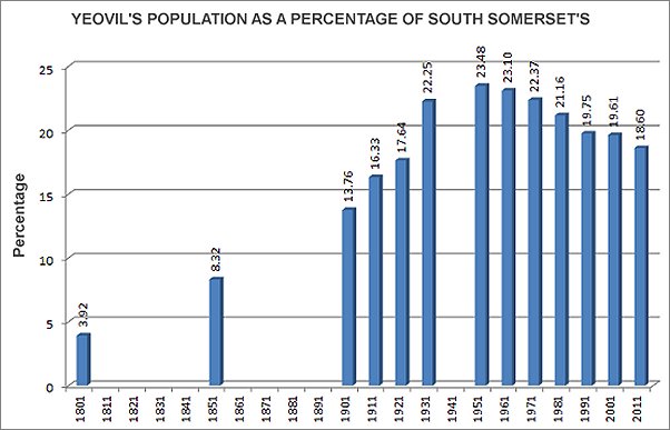 When compared to the whole population of south Somerset, it becomes clear that since the Second World War Yeovil's population has steadily decreased in comparison - perhaps caused chiefly by the rapid decline and eventual demise of the leather and gloving industries in Yeovil. (Figures tabulated below).