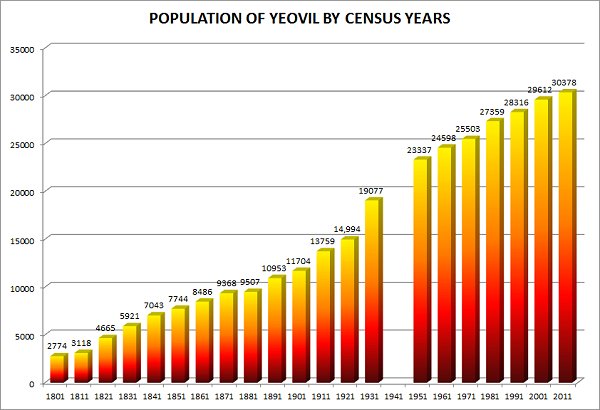 Graph showing the rate of growth of Yeovil over the last two centuries. The figures are for the parish of Yeovil and do not include Yeovil Without (for example 7,260 in 2001) or Brympton (5,268 in 2001). No census was undertaken during the Second World War. (Figures tabulated below).