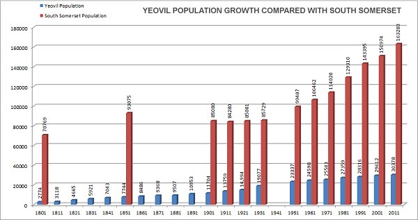 Compared with the sudden growth in the population of south Somerset as a whole following the Second World War (when no census was carried out), Yeovil's population expansion for the same period seems sluggish. (Figures tabulated below).