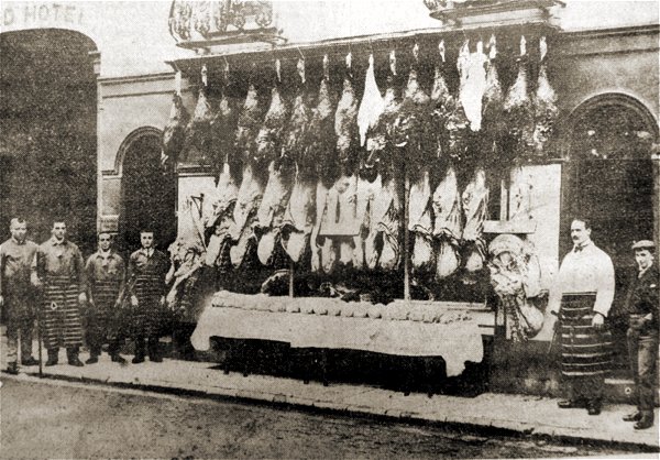 This photograph was taken in 1910 and shows Mr JH Burrows (second from right) and his staff outside his butcher's shop, Hinton Farm Meat Supply, in Princes Street right next to the rear entrance to the Mermaid Hotel seen at extreme left.