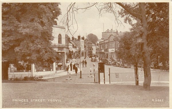 This colourised photograph was taken from Bide's Gardens and shows the northern end of Princes Street / southern end of Kingston, with Court Ash running off to the left. At this time, before Reckleford was made a dual carriageway and Yeovil lost Bide's Gardens (the photographer of this photograph would today be standing on the southern carriageway of Reckleford as it approaches the hospital roundabout), Princes Street ended at North Lane on the eastern side (between the white flank wall and the ivy-covered Magnolia House left of centre) while the western side of Princes Street ended at Park Road (indicated on this image by the flank of three-storey Old Sarum House visible just right of centre).