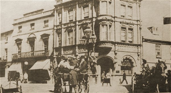 The photograph most likely dates to the early 1920s, yet is probably one of the earliest of this location as witnessed by the building at far left, next to Mansion House and enlarged below, which pre-dates the 1930's Vincent's (now Batten's) building of the previous photograph, on the corner of Court Ash (running off to the left), we are all so familiar with. At right is the shop-front of the sales rooms of Hill & Boll's carriage works.