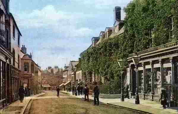 This postcard by William Beale Collins dates to about 1900. At extreme left is just seen the edge of Lindsay Denner's shop and next to it are the remaining shops before he took them over. The two men at centre are standing outside Stuckey's Bank (demolished before 1918) and between the bank building and Genge's shop is the narrow entrance to Porter's Lane (later widened to become today's Westminster Street). William Beale Collin's own printing and bookselling premises are seen at extreme right.