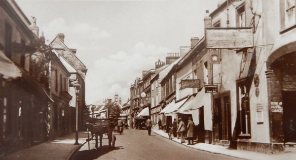 A 1930s postcard of the same view. Wyndham House retains its small front garden and young tree, but notice how the post-box has gone and part of the pavement of the previous photograph has been whittled away in front of Whitby's shop premises. At the far end, on the right, are the newly built Vincent's showrooms on the corner of Court Ash.