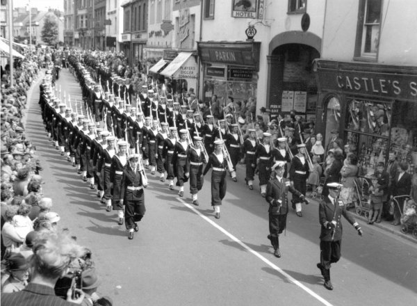 This parade of Naval ratings, with Lt Cmdr Robert Eric Dalzell (Clive's dad) marches past the rear entrance of the Mermaid Hotel around 1955.