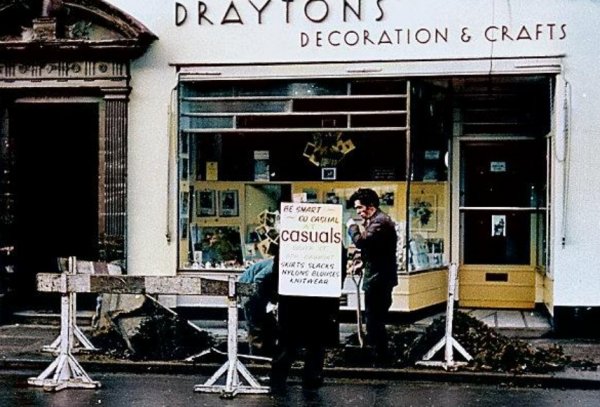 A sandwich-board man (remember them?) stops to chat with two contractor's workers outside Drayton's shop (now Bloor's Pet Stores) around 1963.