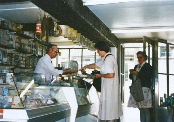The interior of Symes Delicatessen, with Tom Symes serving customers, in a colourised photograph of the 1980s.