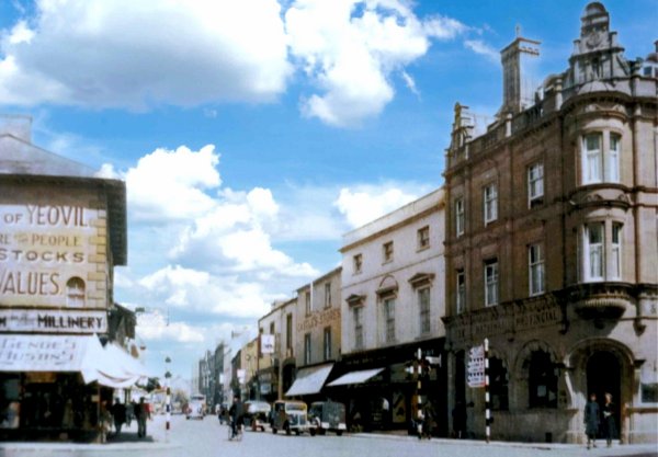 The entrance to Park Road seen from Princes Street in a colourised photograph of the 1960s. Old Sarum House dominating the picture at left, the former home of Yeovil's first mayor, John Ryall Mayo was the Chessman Café on the corner (later Prezzo which occupied the whole building, now a dental practice).